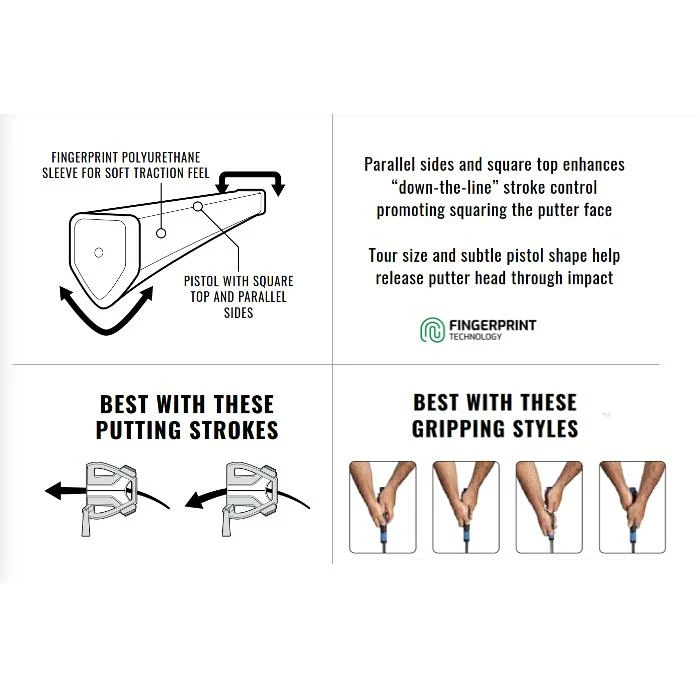 - Unique accentuated square top pistol putter grip